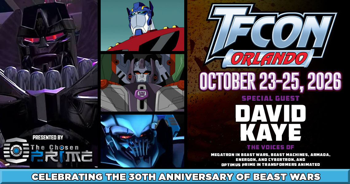 TFcon is very happy to welcome David Kaye the voices of Megatron in Beast Wars, Beast Machines, Armada, Energon, Cybertron and Optimus Prime in Transformers Animated to TFcon Orlando 2026.